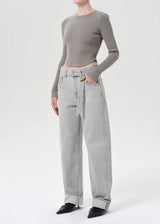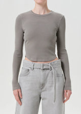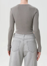 The Neema Tee features a long sleeve design with a curved hem, crafted from ultra-soft, ribbed cotton. Made from a regenerative cotton blend, it offers a supportive fit that’s perfect for layering or wearing on its own.