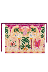 it features a vibrant tropical placement print that highlights palm trees, fruits, and lush florals. Its lightweight feel and versatile wrap-around design make it the perfect companion for sunny days.
