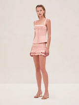 The Ezza Top is cotton poplin button-down featuring delicate scrunched ruffle detailing, paired with the Cosi Skirt.