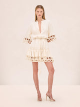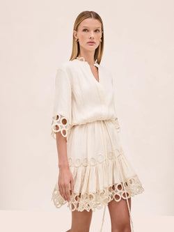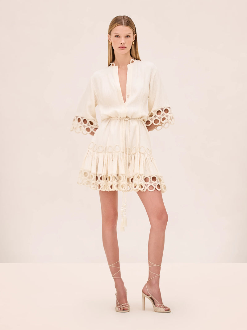 The Kalia Dress is a mini silhouette featuring circular cutout detailing and a tasseled rope belt.