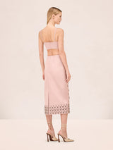 The Luisa Skirt is a midi skirt featuring beaded embellishments and a beaded fringe hem, paired with the Mili Top.