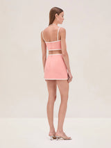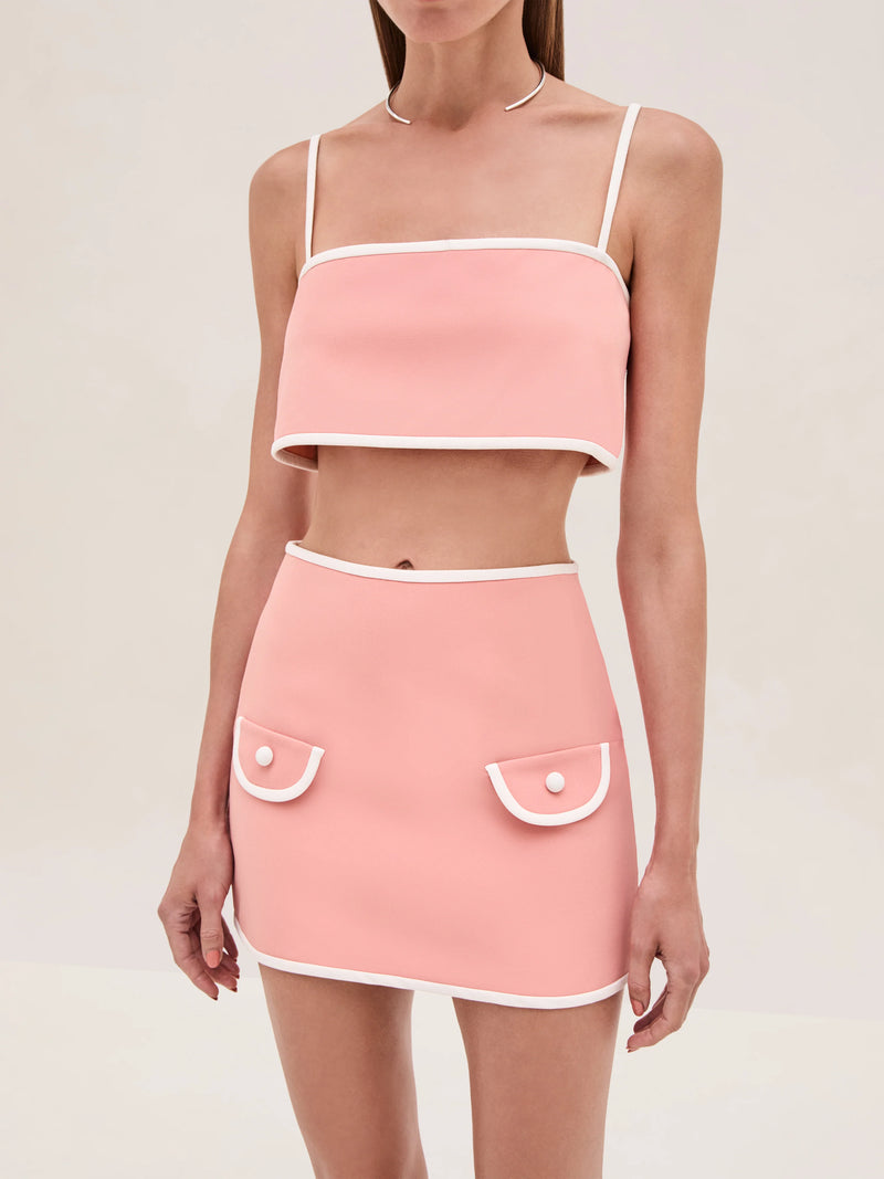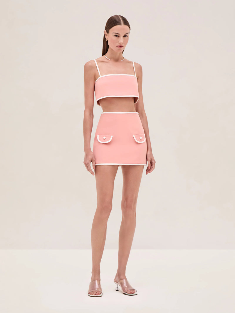 The Rubino Skirt is a crepe mini design featuring contrasting trim detail and structured pocket accents, paired with the Simi Top.
