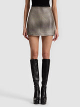 The it-girl mini, reimagined. The Elana skirt is made from lasercut strips of alternating vegan leather, woven together to create a basketweave look. Wear it with the matching Logan coat for an ultra-polished twinset, or pair it with a baby tee and sneakers for off-duty TK vibes.
