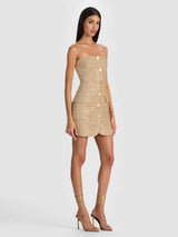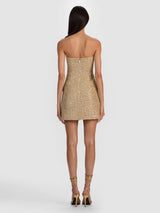 Your golden hour, in dress form. This strapless tweed mini--woven with metallic threads for a subtle sparkle--was made for holiday soirees and champagne toasts. Finished with ornate gold buttons and pocket detailing, it delivers just the right amount of festive glamour while keeping the silhouette chic and streamlined. Add heels, a clutch, and prepare for compliments.