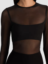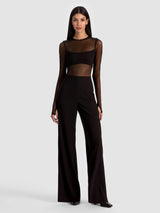 All the impact, none of the effort. Designed to give the illusion of a bandeau bra, sheer top, and wide-leg trousers, this black mesh jumpsuit masters the art of styling for you. Nichol fuses the allure of sheer layers with the polish of tailored pants--for effortless styling in a single piece. The sheer mesh bodice and long sleeves feel both sultry and refined, while the sculpted bandeau lining offers just the right amount of coverage. A high-rise waist flatters and smooths, and the fluid, wide leg silhouette elongates the body for a striking, sophisticated finish. Just zip up and go.