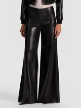 The pant that built a following. Our cult-favorite Olivia is back-this time in soft black vegan leather with a cool-girl wide leg silhouette. The ultra-flattering fit features a low rise, wide waistband, and flare that elongates the leg like magic. A must-have for fall statement dressing.