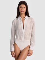 Your favorite button down turned bodysuit is back! Cut in 100% silk, it has everything you love about the Willa - a neat collar, hidden placket, and semi-sheer body - but now with a bodysuit design so you never have to worry about achieving the perfect tuck. A thong bottom with snap closures ensures minimal underwear lines and easy on-off convenience. This pinstriped blouse bodysuit is a true closet must have!