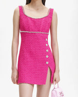 Ladylike dresses have never come this bold and brilliant. Cut from rich, textured bouclé, heightened sensuality comes via the vivid fuchsia hue, leg-lengthening split and glittering diamanté trims. The dress features a flattering scoop neck and is sharply tailored to show off the form. Lean in to its feminine vibe: pair it with platforms and statement earrings with extra sparkle.