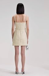 Dazzle in this yellow boucle mini-dress, with diamanté detailing to the straps and bodice. The bustier style bodice is accentuated with a waist-cinching belt and the short mini length flatters the legs. Pair with high heels and old Hollywood waves for timeless glamour.