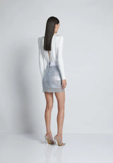 A satin v-neck top with panelled flared sleeves, pleat detail on upper front bodice and shoulder accents.
