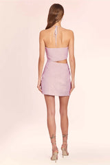 Shine bright in this unique halter mini dress featuring cutout detail at the waist, ruching at the right side skirt, and an invisible zipper at the left side.