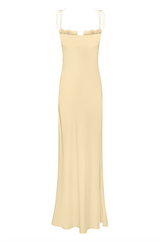 The Tulip maxi dress with a floor-skimming skirt has a slip silhouette graced with a decorated bodice in the shape of tulip cups suspended from delicate self-tying straps. The gown is made from a lustrous satin.