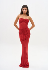 The ERICA Dress is a breathtaking, figure-hugging gown designed to make a statement. This strapless beauty features a structured, ruched bodice that enhances your curves, flowing into a sleek, floor-length silhouette. The soft, stretchy fabric drapes elegantly, creating a flawless, sculpted look perfect for any glamorous occasion.