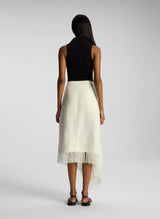 The Amelie Skirt is woven from bouclé yarns in our fringe tailoring fabric in a cream hue. This midi skirt features a wrap silhouette and has an asymmetrical fringed hem.
