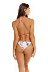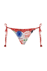 Handmade strap details bring a delicate finish to this adjustable tie bikini bottom. Designed with a placement print in bold cross-stitch inspired motifs, it celebrates artisanal craftsmanship and playful femininity.