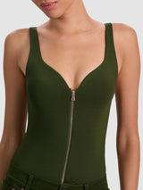 The bodysuit that gives "effortless" a whole new meaning. The Eve combines a sleek jersey fabric with a sweetheart neckline and a front zipper you can wear zipped to perfection or unzipped just enough. The fit is sculpting but comfortable, making it a go-to base for high-rise denim, skirts, or trousers. It's the definition of modern polish--versatile, confident, and a little bit daring. Every wardrobe needs that one bodysuit that does it all; this is it.