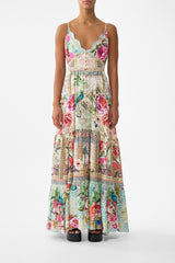 The Sultans And Queens Tiered Bodice Dress is a handcrafted linen silhouette designed by our in house artisans. Reimagined in an exclusive limited edition print, this full length dress features a fitted bodice and adjustable straps for versatility. Its button through front falls into a flared skirt, while intricately placed crystal embellishments complete the design with luminous detail.