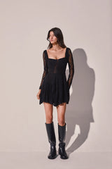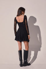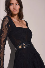 Shine in the SWIRL dress—a romantic mini silhouette that blends delicacy and movement in every detail. Crafted in mesh with a wavy texture, it features a structured bodice with a curved neckline and corset-effect bust defined by sculpted cups that softly enhance the figure. The fitted waist flows into a lightly flared skirt that moves gracefully, reinforcing its feminine and dynamic spirit. Long sheer sleeves balance the silhouette with a touch of sophistication. A perfect piece to shine, day or night.