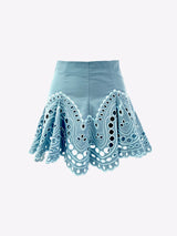 Artisanal embroidery and the scalloped finish at the hem add texture and visual charm, elevating the garment to a sophisticated level. Perfect to pair with structured tops or airy blouses, it’s a versatile piece with a romantic soul.