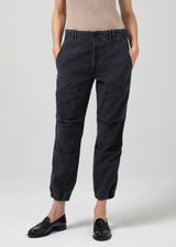An off-duty essential. The Agni Trouser is designed with a utility inspired fold details through the leg. This mid rise fit offers a relaxed feel and tapers to an elasticated cuff.