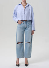 Looks Like: Light blue cropped long sleeve shirt with pointed collar