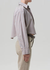 Tailored yet easy, the Ana shirt is crafted from ultra-lightweight, breathable cotton with an airy feel. The cropped cut and pointed collar offer a clean, modern shape, while grey and medium brown stripes bring a refined, masculine edge. Style it solo or layer loosely over a fitted tank or tee.