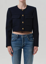 The Sophia Jacket offers a sharp, cropped silhouette cut from ultra-soft wool. Gold button detailing and front patch pockets add polish—ideal over a tee or layered with high-rise denim.