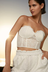 Our beautiful Lita bustier is an essential for your "Resort looks" Its flattering sweetheart neckline enhances the chest creating a radiant silhouette. Its structured body made of embroidered cotton contours the torso and its elasticated back panel adapts perfectly around your figure. Its side zip closure makes this bustier an easy and comfortable garment to wear.