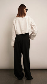 This classic white poplin crop shirt features a timeless button down collar design, perfect for pairing with high-rise pants. Its lightweight fabric and tailored fit create an effortless yet polished look.