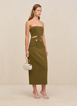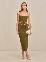 A knit midi dress with a strapless neckline and geometric front cutouts.