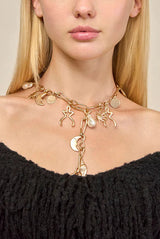 Irregular chain links connect this pendant style necklace decorated with charms and faux pearls.