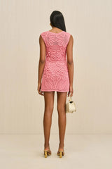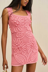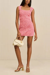 A sleeveless mini dress with a netting body and cord detail floral overlay.