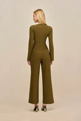 A long sleeve knit top with a fixed wrap front, accentuated by gold-toned hardware.