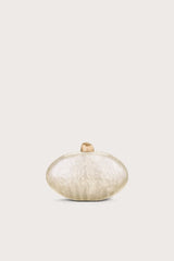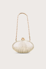 A pearlized acrylic oval shaped clutch with an abstract gold top closure and removable chain strap.