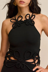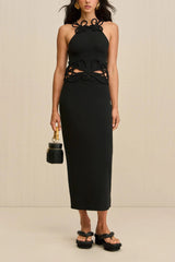 A flattering midi dress designed in a figure-hugging knit fabrication with corded crochet details.