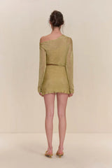 A sheer mini dress crafted in our best selling chainmail knit fabric with an asymmetrical neckline.