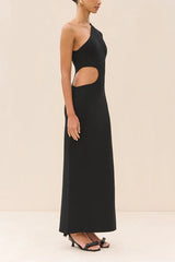 A sleek knit asymmetrical maxi dress with a right waist cutout.