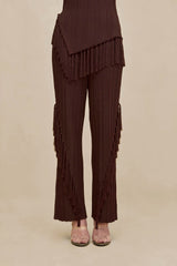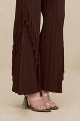 A sophisticated knit pant featuring diagonal lines of tassels that run from the knee to the bottom hem.