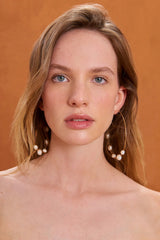 A thin gold brass oversized hoop earring with baroque pearls on bottom curve.