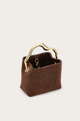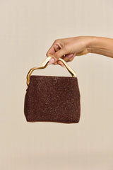 A mini bag crafted from golden rhinestones with a sculptural top handle.