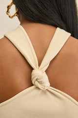 A versatile strapless knit that can be worn two ways: as a choker top or a halter top with a knot front detail.