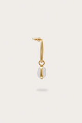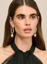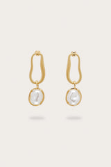 A drop earring featuring abstract gold-toned hardware with baroque pearl accents.