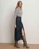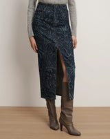 A romantic take on the denim skirt. Crafted from premium Italian stretch cotton, the Devorah features a dark blue wash, laser-printed with an allover floral pattern. Cut in a straight silhouette with a classic five-pocket design, this maxi style is finished with brown topstitching, our signature V belt loops, and a front slit for ease. Pair with a cashmere sweater and tall boots for a polished, layered look.