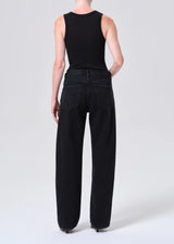 The Arc Criss Cross Jean in Phase updates a signature silhouette in washed black weightless denim. Crafted from regenerative cotton, this non-stretch, soft-to-the-touch fabric offers a worn-in feel with lasting structure. A criss cross waistband and curved leg define its directional shape, creating an elongated, effortlessly modern fit.