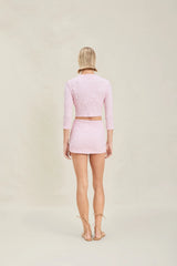 The Jace is a mini skirt with an elastic waistband and pairs back to the Joy Top.
