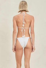 The Lio is a low-rise, cheeky bottom with handsewn, flower detailing on the ends of adjustable ties. Pair back with the Lilah Top.