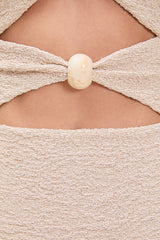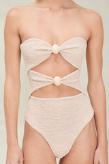 The Misha is a moderate coverage full-piece, with removable pads and a custom bead detail at the front waist and bust. Moderate back coverage. Can be worn with the Eve Skirt.