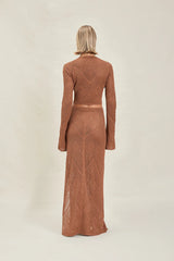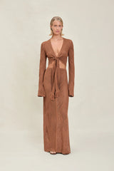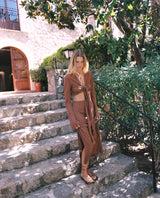 The Vale is a long-sleeved knit tie top with fringe detailing on the ends of the ties. Pairs back with the Vie Skirt or Tyson short.