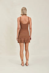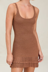 The Willamina is a hand-crocheted, mini dress with a scoop neck and scallop detail along the straps.