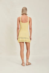 The Willamina is a hand-crocheted, mini dress with a scoop neck and scallop detail along the straps.